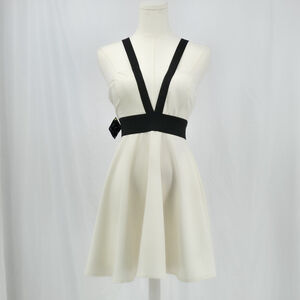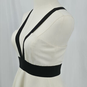 Turn heads in this black-and-white contrast mini dress with bold coquette styling. Featuring a plunging V neckline with wide black harness straps, fitted waist, and flared mini skirt, this piece blends flirty elegance with modern edge. Perfect for cocktail parties, night out, or special occasions.