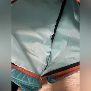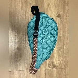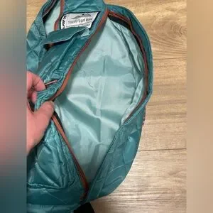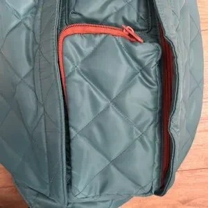 Quilted teal bag with rust zipper. Cross body style. Ideal for everyday use. One large, one medium, and 2 small compartments. Small zippered pocket in main compartment. Slight pen stain inside as shown in picture, cannot be seen from outside.