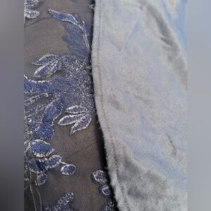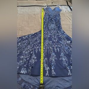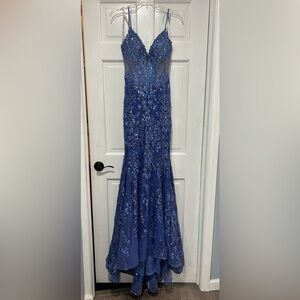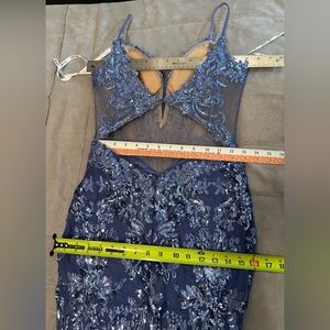Stunning Ellie Wilde Mon Cheri prom dress. Dusk color, periwinkle blue. Covered in sequin and lace. Altered in top, straps were moved in and adjusted for narrower shoulders (please see before and after pic). The back clasps was let out about 1/2 inch. Please see photos for measurements as the top bodice doesn’t have much stretch to it.