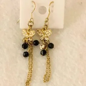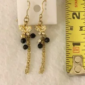 Gold Tone Dangle Earrings with Black Beads and Rhinestone Butterfly