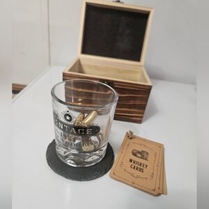 -set includes whiskey glass, coaster, 4 reuseable ice cubes and cards on how to make drinks!