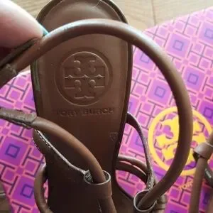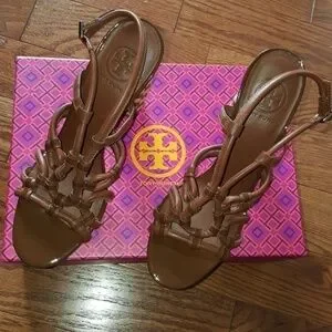Tory Burch rolled leather crafts a keyhole sandal lifted by a blocky , woven heel. Adjustable strap with buckle closure. Approx 4" heel night. Leather upper lining and sole. Made in Brazil. Size 9 M. Box not available. Gently used but in great condition.<84>