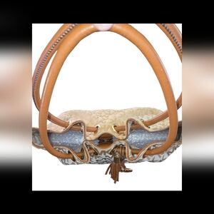 *Leather Trim Dual Shoulder Straps *Leather & Tassel Accents Logo Jacquard *Lining & Five Interior Pockets