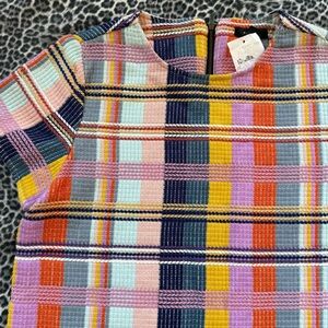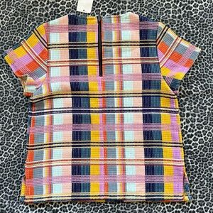 Vibrant plaid tee with short sleeves. Features a mix of pink, orange, yellow, and blue. Perfect for playful days.