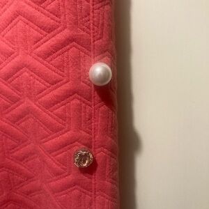 Stylish coral wide-leg pants featuring pearl accents along the sides. Perfect for a chic and comfortable look.