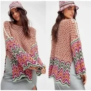 Free People Heatwave Oversized Pullover Cotton Knit Crochet Colorful Sweater