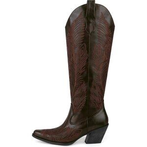 ⚡Women's Brown Knee High Cowgirl Boots with Retro Floral Embroidered Chunky Heel