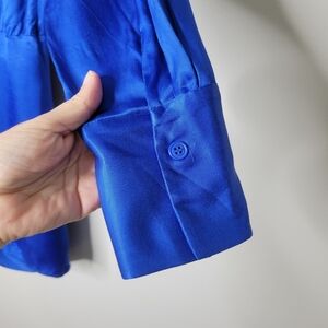 Blue satin long sleeve 1 pocket wrap mini dress.
