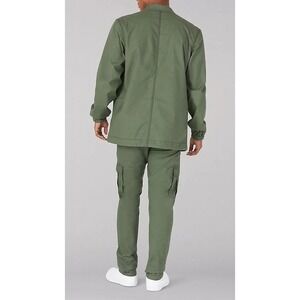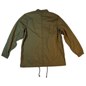 * Color: The jacket is an olive green or a similar military/earthy green shade.