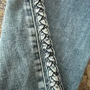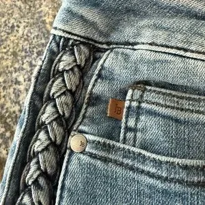 Stylish and comfortable women's blue jeans featuring a unique braided side detail. Perfect for casual outings or dressing up. Enjoy a flattering fit with a touch of elegance.