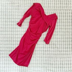 The DVF Diane von Furstenberg BENTLEY Pink Wrap Stretch Ruche Asymmetric Dress in size P is a stunning knee-length sheath dress perfect for weddings, parties, or formal events. The dress features a V-neckline and 3/4 sleeves, with a solid pink color that adds a touch of elegance. Made with stretch fabric, this dress is designed for a more petite size and is ideal for the summer, fall, or spring seasons. The ruche detailing and asymmetric hemline add a stylish and unique flair to the overall design, making it a standout choice for the fashion-forward woman.