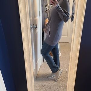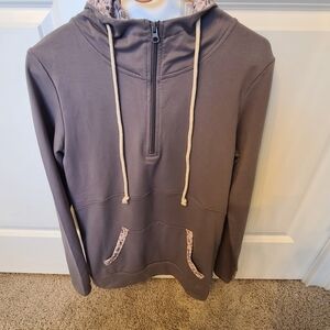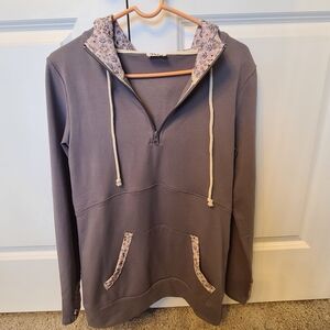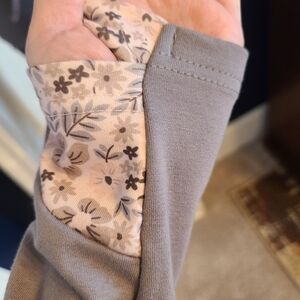 From the Pulse Boutique comes this beautiful gray hoodie with complimentary floral accents. Features a very comfortable fit, soft fabric, and stylish design. Ideal for everyday wear in these chilly winter months! Love that the arm sleeves extend down to your hands and have the loop for your thumb so that you can keep your hands warm! This is essential!