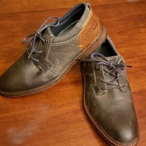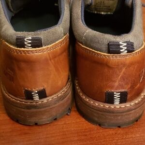 Grey with brown leather heel wrap. Suede around the ankle. Woven fabric look at instep area. "Distressed look"