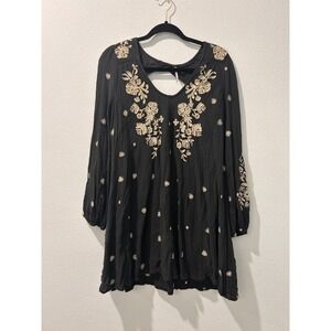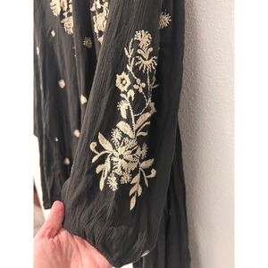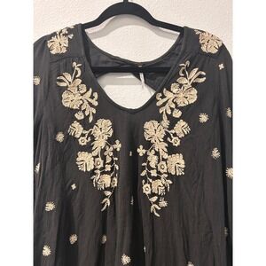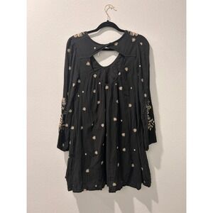 This enchanting Free People dress casts a spell with its bohemian charm. Delicate floral embroidery dances across the bodice and sleeves, adding a touch of whimsy to the dark backdrop. The relaxed silhouette and flowing sleeves create an effortlessly chic look, perfect for twirling the night away. This dress is ideal for a music festival, a casual date night, or a garden party.