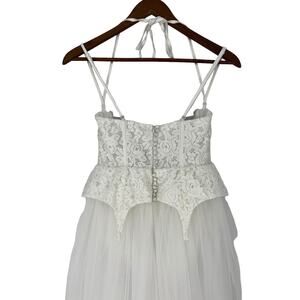The Lily Bridal Dress by For Love & Lemons is a breathtaking blend of romance and allure—perfect for the unconventional bride, rehearsal dinner, or any modern formal event. Designed with a corset-style lace bodice, sheer chiffon maxi skirt, and underwire cups for structure and lift. Delicate adjustable shoulder straps and optional halter ties allow for a customizable fit. The empire waist creates an elongated silhouette while the partially see-through skirt adds dramatic movement. A truly ethereal piece that captures whimsy, femininity, and sophistication in every detail.