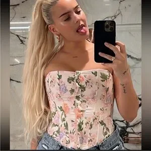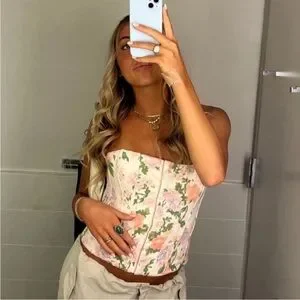 Elevate your style with this elegant Zara floral corset top. Featuring a gorgeous blend of cream and pastel floral tones, this structured piece adds a feminine touch to any outfit. Designed to fit snugly, this corset accentuates the waist for a flattering silhouette — perfect for brunch, date nights, or a night out.