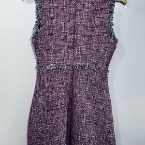 Stylish sleeveless tweed dress with a V-neck. Features pink and black hues with fringe details and front pockets.