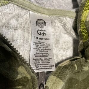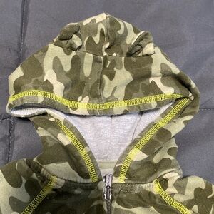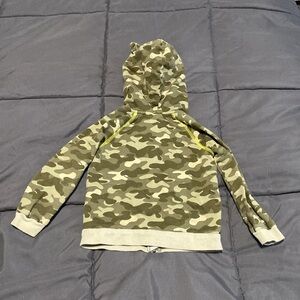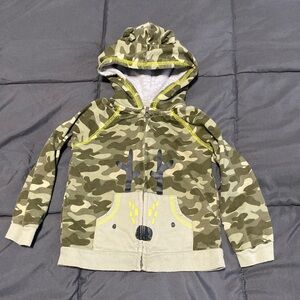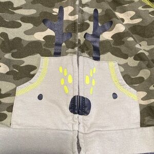 Cute zip up hoodie by Carter's, camo pattern with pockets in the front. Deer on the pockets. Little ears on the hood.