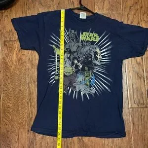 Classic vintage Star Wars graphic tee featuring Luke Skywalker, Yoda, Chewbacca, R2-D2, C-3PO, Darth Vader, and Obi-Wan Kenobi. Navy blue with bold multicolor print. Soft, broken-in feel with authentic vintage wear.