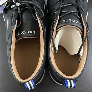 Stylish black sneakers with white accents. Features Lacoste logo. Perfect for casual wear.
