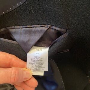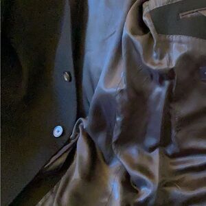 Men’s winter coat in a soft wool cashmere blend. Beautifully crafted by Cardinal of Canada. Black color in a men’s size 42 (will fit a Medium or Large just fine). High tailored collar and 3 large button closure for overall warmth. Slash outside hand pockets and inside breast pockets. Wear with business clothes or with jeans. High quality coat unworn with tags from Nordstrom’s. Very stylish yet classic.