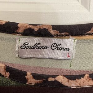 Vibrant striped top featuring bold leopard print sleeves. 3/4” sleeves. Perfect for adding a pop of color to your casual wardrobe.