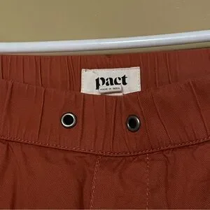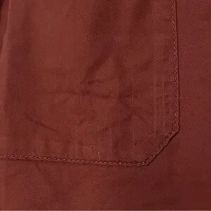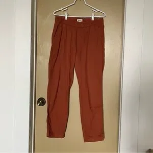 Women’s daily wear comfortable pants with elastic waist in a rusty reddish brown color. The white drawstring is missing. I would still wear these but need to size down. There is unremarkable thread pulling on the back pocket shown in photo.