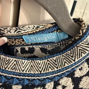 Elegant dress with intricate blue and white patterns. Features a unique neckline design.