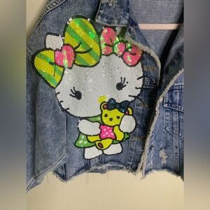 Stylish kids denim jacket featuring a colorful sequin design. Perfect for adding a fun touch to any outfit.