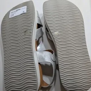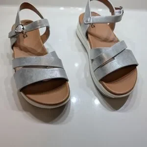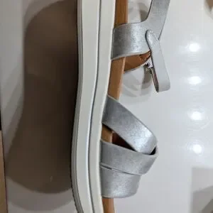 Brand New with Tags and Box. Stylish and comfortable silver sandals with sponge like shock absorbing like sole. Dress down or up, great for travel. Comfortable and elegant. Women's size 7.5.