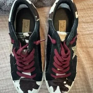Stylish athletic shoes with a glitter star design. Features black and white cow print. Burgundy laces add a pop of color.