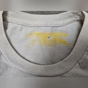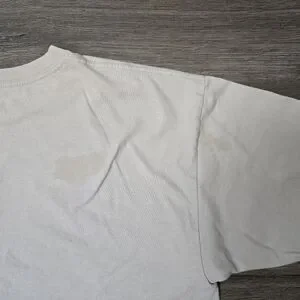 Very cool tee! Please see photos for measurements as I am not able to read the size. There are 2 tiny holes in the collar and 2 spots of discoloration on the back. Please see all photos. Unisex.