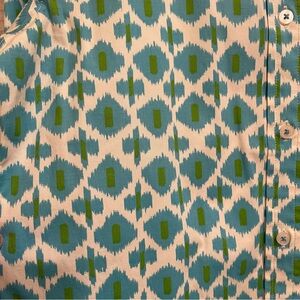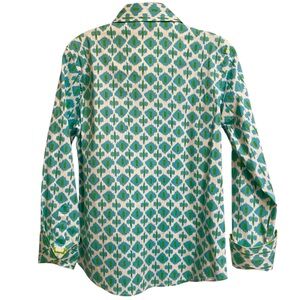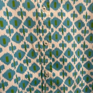 Tizzie Cotton Poplin Ikat Print Turquoise & Chartreuse Button Up Shirt Blouse M