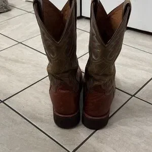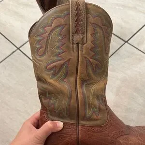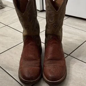 Stylish Ariat cowboy boots. Rich brown leather with tan accents. Classic western stitching. 9.5 men’s. Very gently worn! Excellent used condition with a ton of life left :)