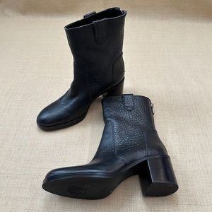 Black pebble leather. Black of heel zipper! 2.5in heel. Rounded pointy toe. Dual pull tabs on sides.