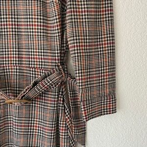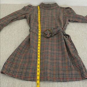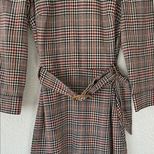TRF Collection Zara chic plaid dress with a stylish belt. Perfect for any occasion. Has high neck, cute button opening to waist, belt with belt buckle and side zipper. Skirt area is lined. Very cute and versatile dress. Size XS.