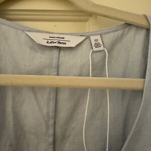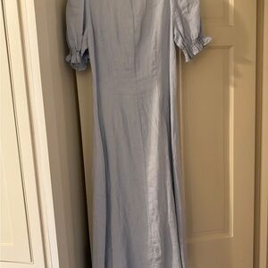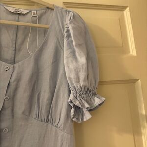 Chic sky blue midi dress. Features puff sleeves and button-down front. Ideal for versatile styling. Tag has come off but never been worn. Non smoking home.
