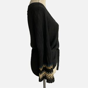 Featuring pointelle knit sleeves with multicoloured chevron detail on the bell sleeves.
