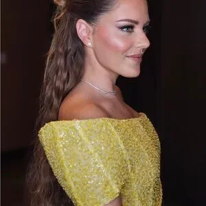 Stunning yellow evening gown with a shimmering finish. Perfect for formal events.