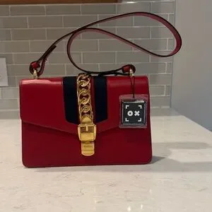 Add a touch of sophistication to your outfit with this chic Gucci Hibiscus (red) shoulder bag, featuring a luxurious gold chain detail. Ideal for any occasion.