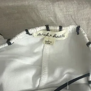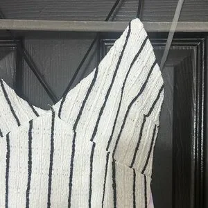 Chic midi dress with black stripes. Spaghetti straps and v-neckline. Perfect for casual outings.