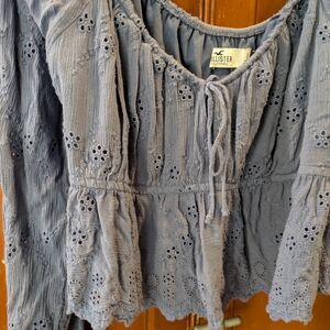 Blue long-sleeve cropped blouse with eyelet details. Features long bell sleeves and a tie front. cottage core style. brand: Hollister. size: large. condition: used, good.