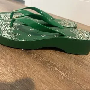 Elegant green sandals with paisley design. Features iconic Tory Burch logo. Ideal for casual wear. I can’t seem to find the size but I wear and 8.5 - 9 and they are the perfect fit! So cute I just have too many flip flops!