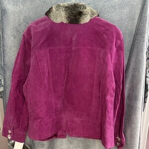 Stylish magenta suede jacket with a plush faux fur collar. Ideal for a sophisticated look.
