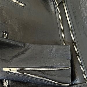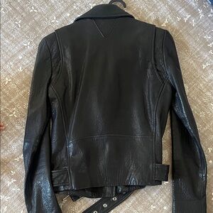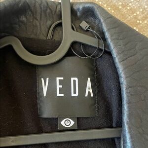 Clearing out my closet! Sleek black leather jacket by Veda. Features asymmetrical zipper and belted waist. Perfect for a chic look. Size P = XS. Wonderful condition, no flaws noted.