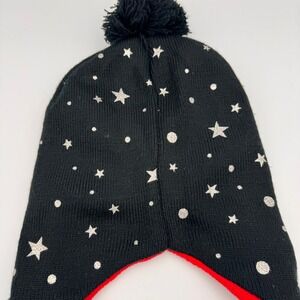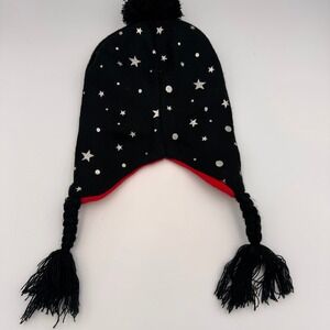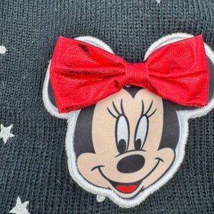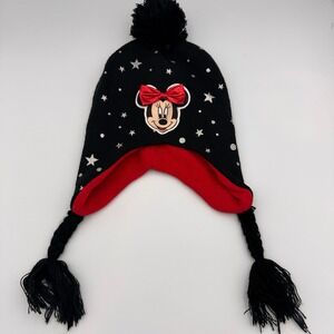 Keywords: Minnie Mouse hat, kids winter hat, girls beanie, black knit hat, red pom pom hat, braided pigtail hat, star print hat, Disney character hat, children's winter accessory, warm winter hat, cozy hat, playful hat, themed hat, cold weather gear