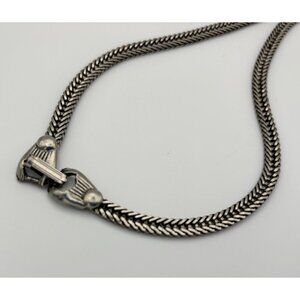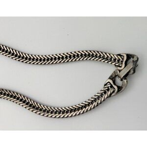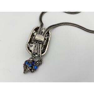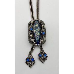 Pewter colored base metal features a large confetti. opal, lucite stone set in decorative slide. The ends of the lariat feature animal heads (owls) ending in two blue rhinestones. There are also two hidden animal facces around the opal - a bear and a cat face.