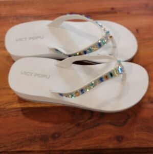 New 2.5 inch heel flip flop platform sandals. white with black stripe, crystals are blue, aqua, clear, yellow, silver.