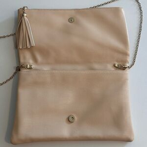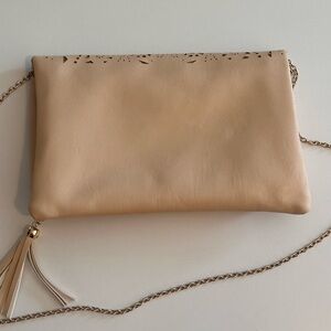 Gorgeous bag! Can be used as a clutch or crossbody with the gold chain strap. Beige color with gold underlay. Large front zippered flap opens to large interior. Open pocket underneath. Stays shut with magnet. Carried only a few times. Gorgeous! 12.5” wide. 8” tall. (Not from Anthropologie- used brand name for visibility- similar style)