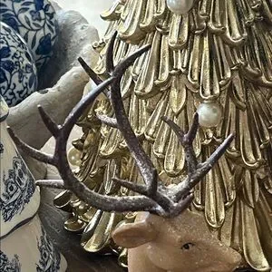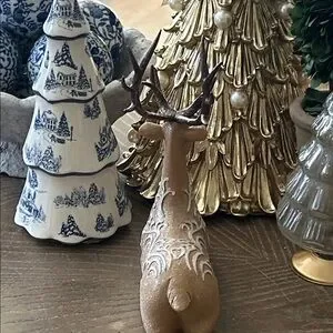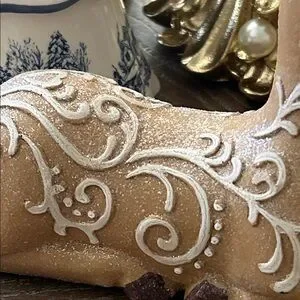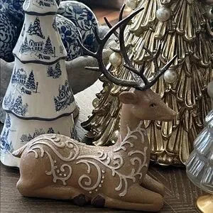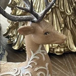 OH My Gosh This Iced Gingerbread Reindeer Is So Sweet! Absolutely Adorable sparkly glitter accented resin Gingerbread winter deer! This darling kneeling reindeer is so detailed with sparkling glitter accented white frosting & icing swirls! Just lovely for a hot chocolate cocoa or coffee bar this winter holiday season! Add to a tiered tray cake stand or riser to add depth & dimension to your winter holiday display! Makes a fabulous centerpiece on your kitchen or dining room table! Add to your holiday dessert buffet for a sweet touch! Very versatile use all winter long well past the Christmas holidays! Makes an elegant addition to a fireplace mantel or bookcase! Please visit my closet for more beautiful seasonal home decor & gifts! Find coordinating standing deer as seen in the last photo listed separately in our closet.